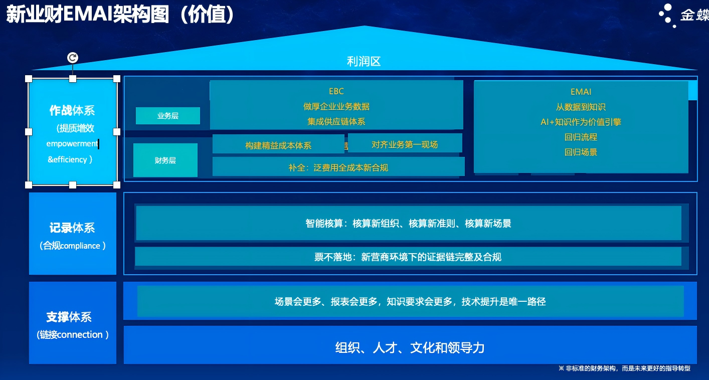 为了更好地理解这个体系,我们梳理了企业业财AI的架构图。最底层是支撑体系,技术是帮助企业走出任何周期的决定性因素。在当前环境下,业务场景不会减少,报表不会变简单,会议也不会缩减,但技术平台可以实现这些场景的自动化与智能化支撑,从而帮助企业摆脱“内卷”的困境。这并不是简单的企业职能裁剪,而是借助技术为企业打开更充分的想象空间。
